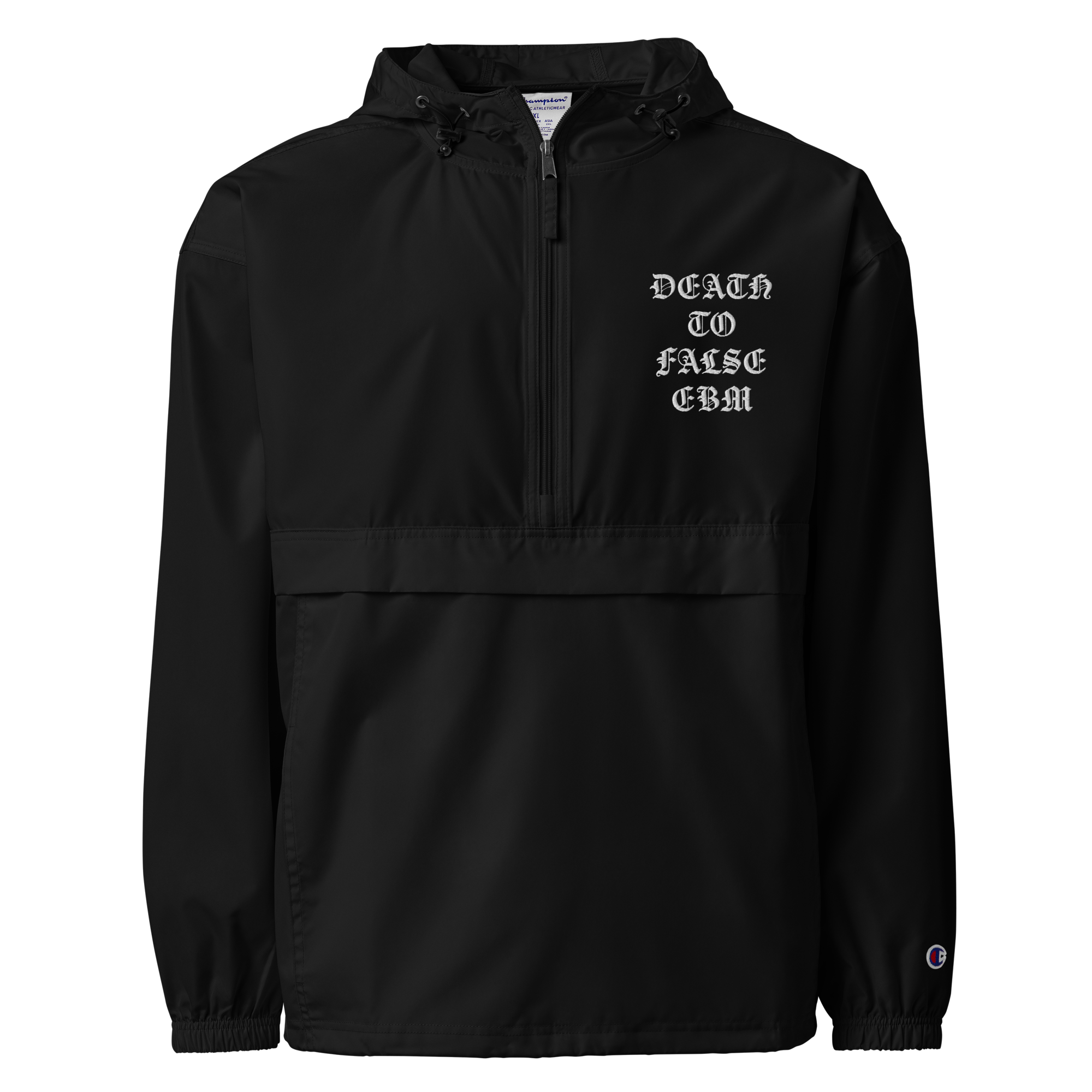 Death to Wind and Rain and Snow! The Death to False EBM logo embroidered on a fancypants windbreaker jacket. The I Die: You Die x Second Tooth collab you did not know you needed! A fat slice of proceeds will be donated to Doctors Without Borders.