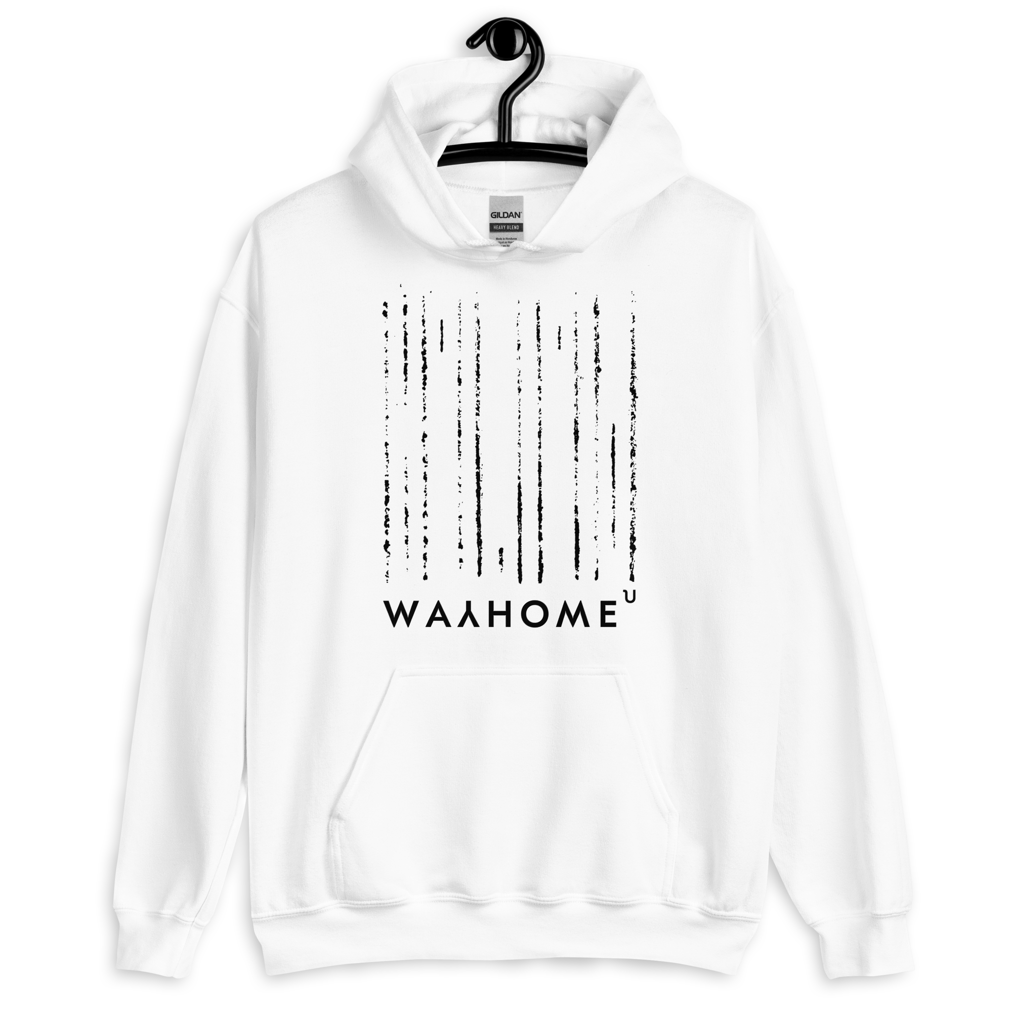 Double-sided deluxe KAUAN Wayhome Hoodie. White, super-soft material, Wayhome design on the front, KAUAN stylized U logo on the back.