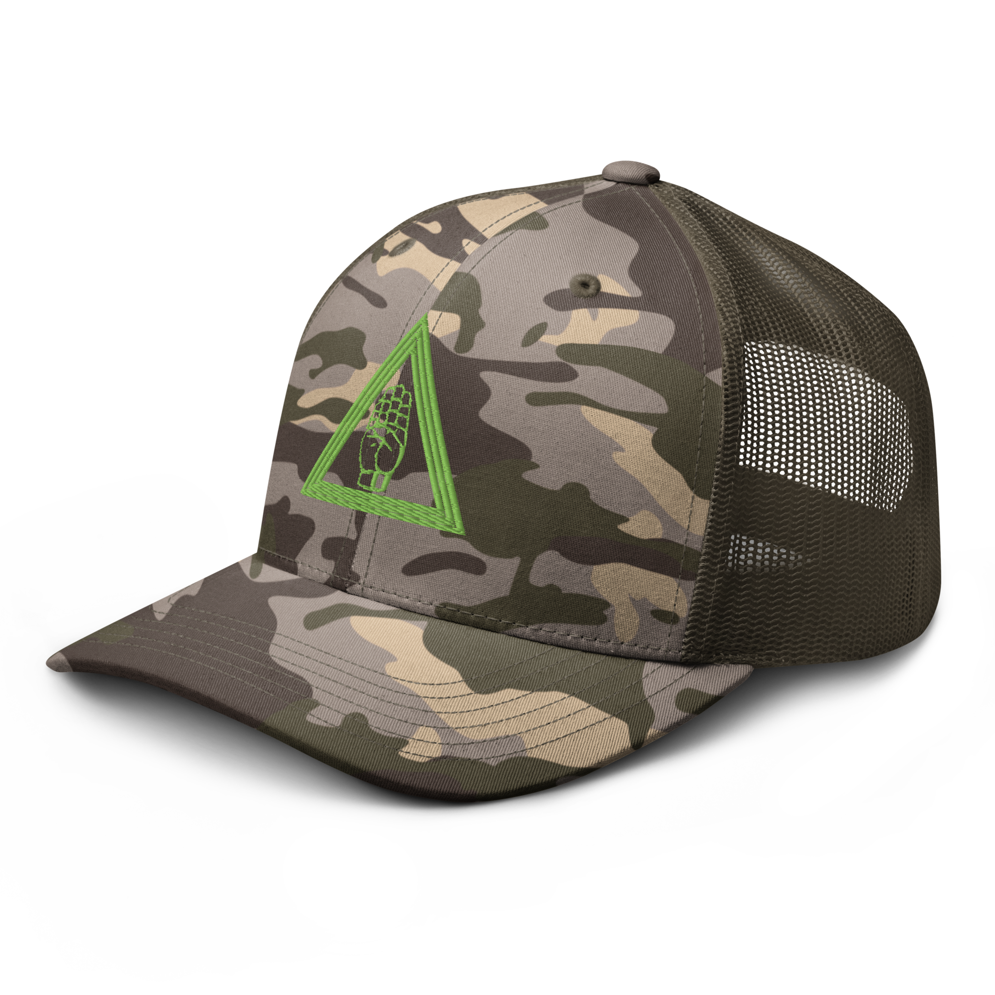Bootblack's "Triangle:Hand" logo embroidered in slime green on three different camo design options.