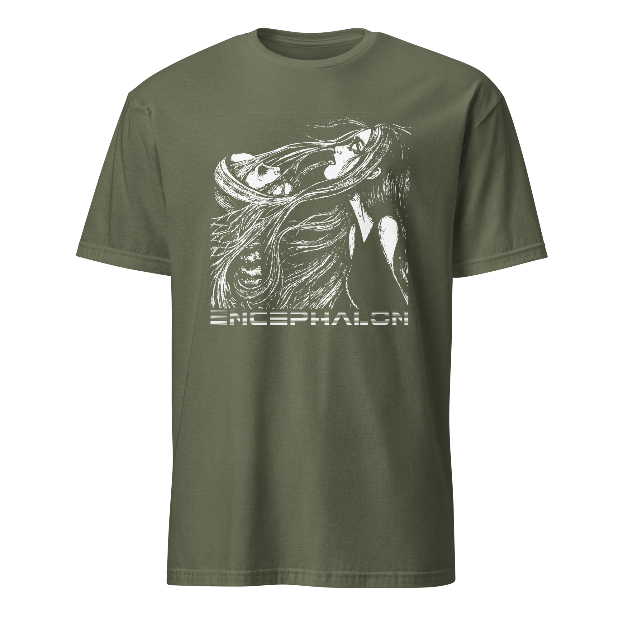 A beautiful super-soft T-Shirt from Ottawa's industrial-EBM powerhouse Encephalon! Features the classic line-drawing artwork "Staring in the Face of Death". Limited Earth Tone Variants edition.
